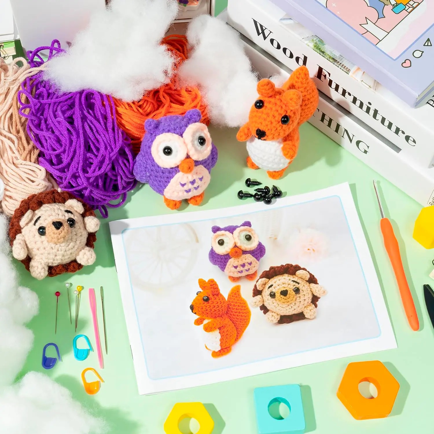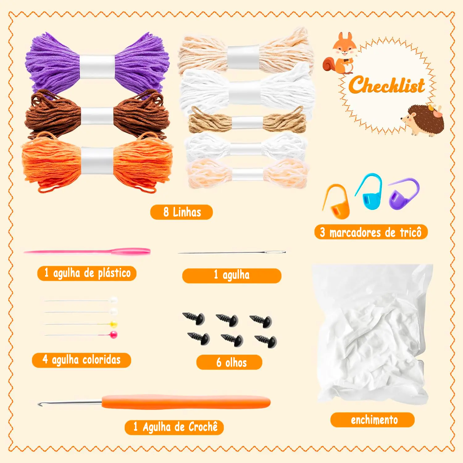 Ao contrário dos métodos convencionais, nossos kits incluem todo o material necessário:Agulhas, algodão, linhas, botões, tesoura e clips - tudo cuidadosamente selecionado e incluído no kit para garantir que você tenha o necessário para cada projeto.