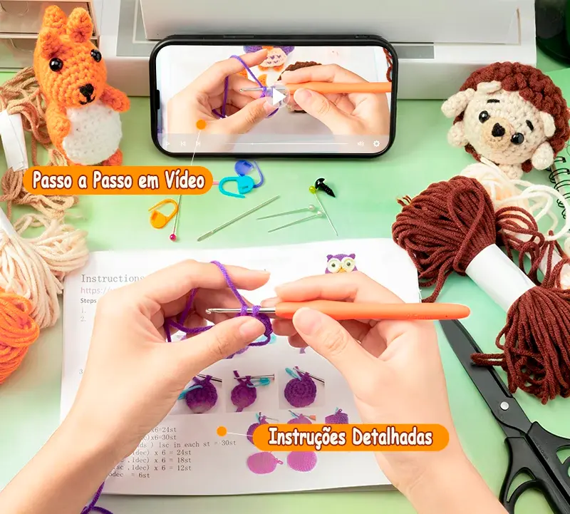 E o mais incrível: você terá acesso ao guia passo a passo do seu amigurumi. São vídeo aulas curtas e fáceis de entender que você pode acompanhar pelo celular enquanto faz seu boneco de crochê. Isso significa que você não precisa se preocupar em decifrar padrões complicados ou se perder em tutoriais confusos. Nós descomplicamos o processo, garantindo que mesmo iniciantes possam criar amigurumis encantadores sem estresse.